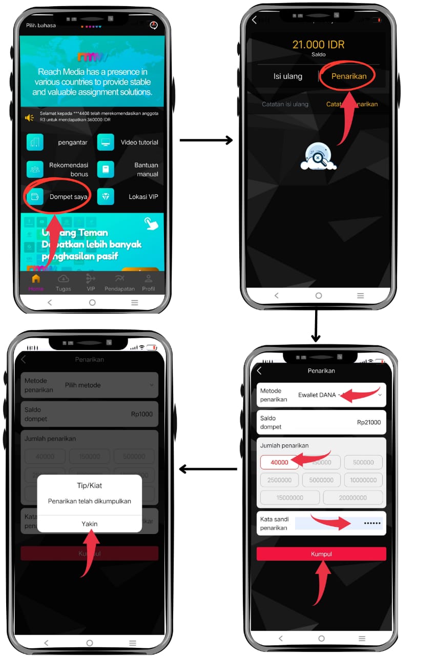 Anda dapat melakukan penarikan dana tunai ke akun bank atau akun e wallet yang telah di daftarkan, anda juga perlu menentukan kata sandi penarikan sebelum melakukan penarikan, ketika semua sudah siap anda dapat melakukan penarikan dengan langkah berikut:
